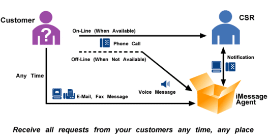 iMessage Agent可與您已有的ACD系統(tǒng)集成,當(dāng)目標(biāo)CSR不在時(shí)電話系統(tǒng)就將呼叫交付給iMessage Agent,iMessage Agent接到呼叫之后將對(duì)呼叫方進(jìn)行合適的問候,再將消息存儲(chǔ)在郵件服務(wù)器中。根據(jù)預(yù)定義的規(guī)則,消息會(huì)被隨后路由到正確的消息框中。
