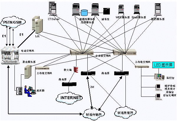 省客戶服務中心受總部客戶服務中心的監(jiān)督和管理,省中心系統(tǒng)通過通信服務器與全國中心系統(tǒng)互通信息,本系統(tǒng)通信服務器采用JAVA編寫,符合《中國聯(lián)通客戶服務系統(tǒng)H1接口規(guī)范》。