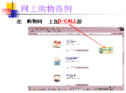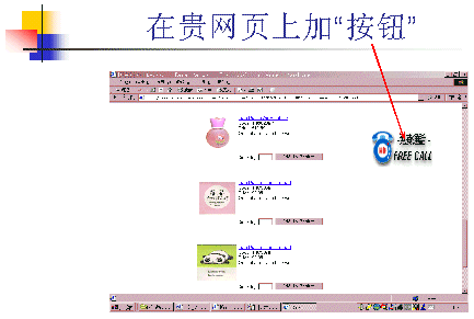 簡單地說,就是當有客戶瀏覽到網(wǎng)上購物的網(wǎng)頁時,若有任何疑問或想立即購買,只要點擊在網(wǎng)頁上的“按鈕”鍵,就可以直接接通到網(wǎng)站的客服中心,實現(xiàn)即時地語音互動。也不需再像以前那樣發(fā)E-MAIL或撥電話號碼了。效果可謂是立竿見影。(如圖示)