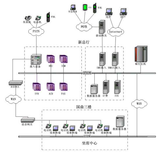 溫州商業(yè)銀行Call Center 項(xiàng)目采用基于Dialogic語音卡的板卡方案,由于坐席分布在兩個(gè)不同地方(新總行和國鼎),因此,采用了Intel