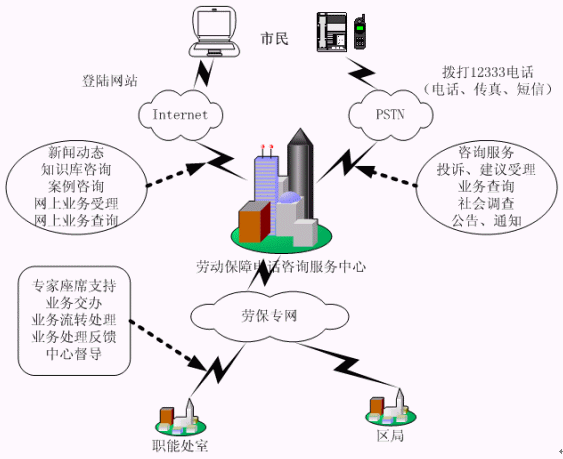 合肥市12333電話咨詢服務(wù)系統(tǒng)的建設(shè),使勞動和社會保障業(yè)務(wù)延伸到市民、企業(yè)的身邊?朔赜蚝蜁r(shí)間的限制,實(shí)現(xiàn)了每天24小時(shí)不間斷地隨時(shí)提供服務(wù)。該系統(tǒng)的建設(shè)將原本分散在各部門的對外服務(wù)業(yè)務(wù)內(nèi)容,集中在一個(gè)統(tǒng)一的對外服務(wù)"窗口",并與就業(yè)、失業(yè)、養(yǎng)老、醫(yī)療、生育及勞動關(guān)系等管理系統(tǒng)建立接口,實(shí)現(xiàn)資源共享,為勞動者提供包括電話、傳真、電子郵件、因特網(wǎng)等多種方式熱線咨詢服務(wù),從而架起勞動者與勞動部門之間密切聯(lián)系的橋梁,使廣大勞動群眾的權(quán)益真正落到了實(shí)處。樹立勞動和社會保障行業(yè)系統(tǒng)的良好服務(wù)形象。推動勞動保障局管理和服務(wù)的社會化,實(shí)行全面的標(biāo)準(zhǔn)化、規(guī)范化、制度化和網(wǎng)絡(luò)化的完善的服務(wù)。