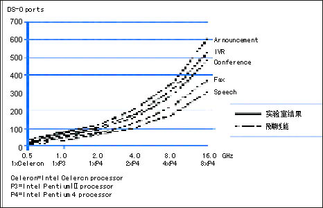 圖1顯示了主要的通信媒體處理功能的實驗測量結果和預期性能。Intel 編制的HMP軟件,在Intel的從566 MHz 到 2 GHz的Celeron和 Pentium 處理器上,已經(jīng)對語音宣告、IVR和會議算法完成了實現(xiàn)、優(yōu)化和測試。圖1中的實線表示實驗室中的測試結果。Intel的目標是實現(xiàn)這些算法,并擴展到更高速的Intel Pentium處理器,雙路、四路、甚至八路Intel Pentium處理器、Intel Xeon處理器以及Intel Itanium處理器。圖1中的虛線顯示了Intel所期望的在未來的實現(xiàn)中將得到的結果。目前,HMP的版本主要以Windows為主,很快就會推出Linux版本。從根本上說,HMP最適合用在純IP的環(huán)境,也可通過擴展到多個服務器實現(xiàn)密度的提升。