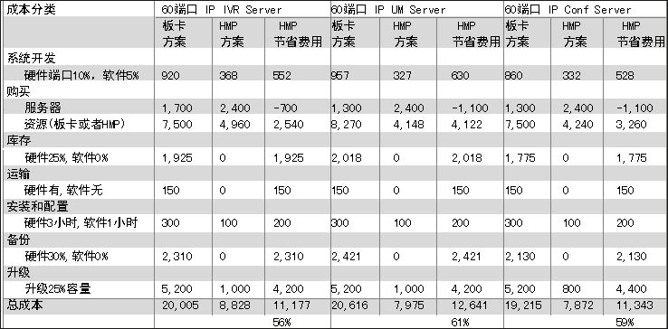 在眾多好處當中,對用戶最有吸引力的無疑是節(jié)省成本。張怡國特別強調,對一個應用系統(tǒng)而言,成本的計算不應該單以產(chǎn)品端口購買價格考核,而應該是系統(tǒng)總的建設成本,包括產(chǎn)品購買成本、服務器成本、運輸、安裝、庫存、升級等多項費用;贖MP1.1版本,張怡國作了一個比較,以60端口IP IVR 60、端口IP UM或者60路會議為例,和語音板卡處理方式相比,基于HMP軟件實現(xiàn)能有近60%的成本節(jié)省,其中采購能節(jié)省20%,庫存節(jié)省20%,備份節(jié)省20%,升級節(jié)省近40%。
