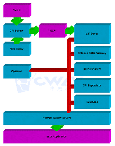 說明:圖中所有的設(shè)備都是通過網(wǎng)絡(luò)和CTI服務(wù)器交互的,我們內(nèi)部都是通過遠(yuǎn)程監(jiān)控API接口與服務(wù)器通信,也就是說,只要用戶可以按照遠(yuǎn)程監(jiān)控API的規(guī)范開發(fā)出具有自己特色的計(jì)費(fèi)系統(tǒng)、監(jiān)控系統(tǒng)等等。