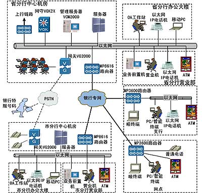 VG2000 IP電話(huà)語(yǔ)音網(wǎng)關(guān),支行采用以太網(wǎng)IP數(shù)字電話(huà)機(jī),網(wǎng)點(diǎn)則根據(jù)需要可以采用IP數(shù)字電話(huà)機(jī)或普通電話(huà)機(jī)。只要網(wǎng)點(diǎn)安裝的路由器是MP2600/2500產(chǎn)品,就可以通過(guò)在路由器上加裝IP電話(huà)模塊,直接實(shí)現(xiàn)普通電話(huà)機(jī)的IP話(huà)音接入。