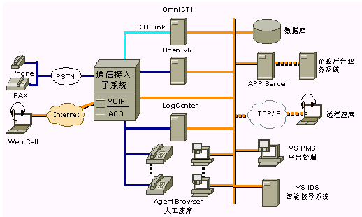 VS CommSuites除了提供傳統(tǒng)呼叫中心功能外,還增加了IPCC功能,是一個全方位的解決方案,下面是系統(tǒng)的結(jié)構(gòu)圖: