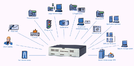 - 一體化:將多項(xiàng)功能集成到一個單一設(shè)備中,這些包括:因特網(wǎng)接入、E-mail服務(wù)器、局域網(wǎng)、計算機(jī)電話集成(CTI)、呼叫管理(嵌入式個人助理及語音信箱,內(nèi)部移動通信等)。