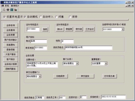為了與民航、公路的競爭,改變“鐵老大”的形象,北京、西安等鐵路分局建立了客戶服務(wù)中心(呼叫中心),為旅客提供火車到/離站時(shí)間查詢,電話預(yù)定車票,網(wǎng)上預(yù)訂車票等業(yè)務(wù),深受旅客的歡迎,取得了顯著的經(jīng)濟(jì)效益和社會效益。
