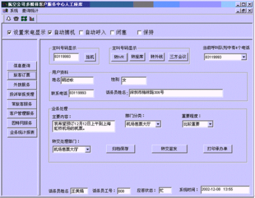 。。客戶打入電話后,當(dāng)系統(tǒng)的自動(dòng)語(yǔ)音應(yīng)答子系統(tǒng)無(wú)法解決客戶問(wèn)題時(shí),客戶可選擇人工服務(wù),由航空公司客戶服務(wù)代表直接接聽(tīng)客戶電話,處理并解決客戶問(wèn)題。此時(shí)客戶同座席話務(wù)人員直接溝通,并同時(shí)記錄下該客戶的聯(lián)系方式,將相關(guān)數(shù)據(jù)添加入系統(tǒng)數(shù)據(jù)庫(kù);也可以在數(shù)據(jù)庫(kù)的支持下回答機(jī)場(chǎng)航班/航空貨運(yùn)信息及相關(guān)規(guī)定等的咨詢和疑問(wèn)、訂座/訂艙?蛻粢部梢赃x擇自動(dòng)語(yǔ)音服務(wù)方式,根據(jù)系統(tǒng)的語(yǔ)音提示輸入按鍵,選擇類(lèi)別,將自己的投訴和建議以及自己的聯(lián)系方式信息以留言錄音的方式保存在系統(tǒng)中。系統(tǒng)同時(shí)還支持自動(dòng)傳真方式,客戶可以通過(guò)傳真機(jī)進(jìn)入本系統(tǒng),通過(guò)按鍵選擇傳真方式,將自己的意見(jiàn)建議等的文本內(nèi)容傳真給系統(tǒng),系統(tǒng)自動(dòng)接受并存入數(shù)據(jù)庫(kù)。