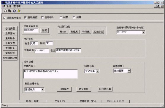 客戶打入電話后,當(dāng)系統(tǒng)的自動語音應(yīng)答子系統(tǒng)無法解決納稅人問題時,客戶可選擇人工服務(wù),由客戶服務(wù)代表直接接聽納稅人電話,處理并解決納稅人問題。此時納稅人同座席話務(wù)人員直接溝通,并同時記錄下該客戶的聯(lián)系方式,將相關(guān)數(shù)據(jù)添加入系統(tǒng)數(shù)據(jù)庫;也可以在數(shù)據(jù)庫的支持下回答國家和地方的稅收政策及相關(guān)規(guī)定等的咨詢和疑問?蛻粢部梢赃x擇自動語音服務(wù)方式,根據(jù)系統(tǒng)的語音提示輸入按鍵,選擇類別,將自己的投訴和建議以及自己的聯(lián)系方式信息以留言錄音的方式保存在系統(tǒng)中。系統(tǒng)同時還支持自動傳真方式,客戶可以通過傳真機(jī)進(jìn)入本系統(tǒng),通過按鍵選擇傳真方式,將自己的意見建議等的文本內(nèi)容傳真給系統(tǒng),系統(tǒng)自動接受并存入數(shù)據(jù)庫。