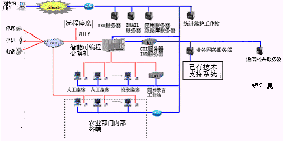 農(nóng)業(yè)分布式呼叫中心系統(tǒng)是利用當(dāng)代信息技術(shù),尤其是以計(jì)算機(jī)電信集成(CTI)為核心的呼叫中心(CALL CENTER) 技術(shù),建立分布式呼叫中心系統(tǒng);它可以作為連接廣大客戶和農(nóng)業(yè)部門(mén)的橋梁,是農(nóng)業(yè)部門(mén)管理窗口的延伸和對(duì)客戶進(jìn)行電子化服務(wù)的門(mén)戶。