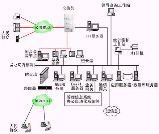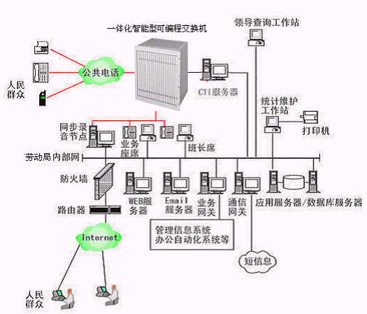 勞動局多媒體呼叫中心系統(tǒng)主要是由智能型可編程交換機或帶語音板卡的工控機或排隊交換機、CTI服務(wù)器、IVR(交互式語音應(yīng)答)/IFR(交互式傳真應(yīng)答)子系統(tǒng)、人工座席子系統(tǒng)、應(yīng)用服務(wù)器、數(shù)據(jù)庫服務(wù)器、業(yè)務(wù)網(wǎng)關(guān)子系統(tǒng)、WEB服務(wù)器、電子郵件服務(wù)器、防火墻、通信網(wǎng)關(guān)等硬件設(shè)備和應(yīng)用軟件組成。