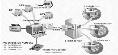 每一個 e-mail地址都可以對應(yīng)一個獨立的傳真分機(jī)號碼,當(dāng)有傳真呼入時,自動地將傳真發(fā)送給指定的接收者