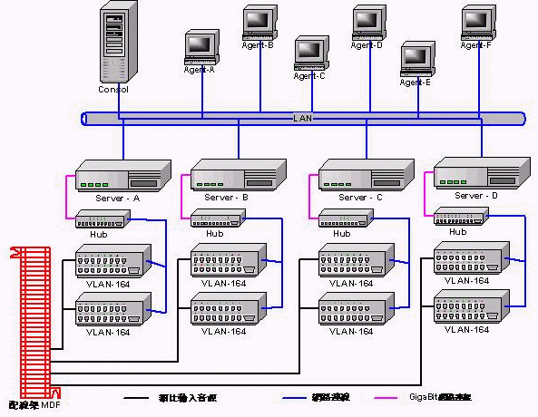 - 系統(tǒng)主要包括二大主機并由網(wǎng)絡聯(lián)機(TCP/IP協(xié)議)作為彼此與遠程的溝通橋梁。一是錄音接口主機(VLAN-164)具備模擬輸入音源的匹配接口、音源數(shù)字化、網(wǎng)絡聯(lián)機輸出。一是數(shù)據(jù)庫服務器(DataBase