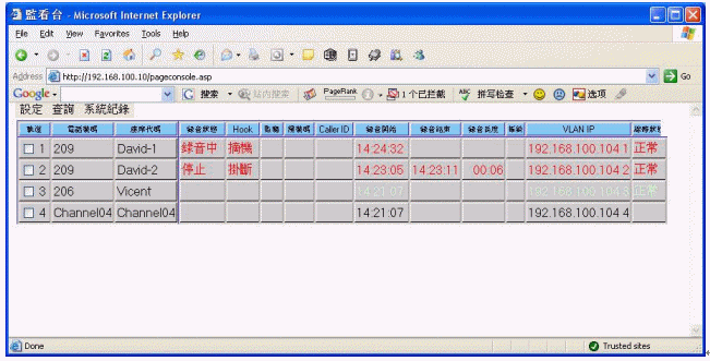 監(jiān)看臺:系統(tǒng)登入后的主畫面,可以監(jiān)控各路電話的當前使用情況(包括來電號碼、去電號碼、振鈐次數(shù)、錄音開始時間、錄音結(jié)束時間、線路狀況等信息)。并可以實現(xiàn)對任意通話的網(wǎng)絡實時監(jiān)聽。