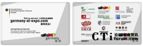 CTI論壇(ctiforum)5月17日消息(記者 潘婷婷):2010年5月,世人矚目的上海世博會(huì)已經(jīng)隆重開幕,德國(guó)館是其中的大熱門之一。想一睹德國(guó)館的風(fēng)采,一般都需要排2~3個(gè)小時(shí)的長(zhǎng)隊(duì)。而觀眾可能不知道除了德國(guó)國(guó)家館外,德國(guó)還有多個(gè)城市在浦西的城市最佳實(shí)踐區(qū)展出。為了讓觀眾更好、更全面地體驗(yàn)德國(guó)參展的所有活動(dòng),德國(guó)駐上海總領(lǐng)事館聯(lián)手智能卡領(lǐng)域的專家捷德公司共同推出了德國(guó)館智能參觀卡,觀眾只需持卡參觀德國(guó)的其他相關(guān)展區(qū)后,就可以不用排隊(duì)進(jìn)入德國(guó)國(guó)家館了。