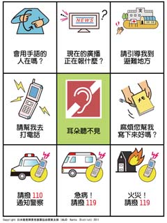 此次沖電氣和AAJD共同制作了“SOS卡片”,在日本的不會(huì)說(shuō)日文的外國(guó)人和聾啞人在突發(fā)事件和生病時(shí)可以通過(guò)指卡片方式告訴對(duì)方自己的身體狀況。2007年先在網(wǎng)站上公開(kāi)了日語(yǔ)和英語(yǔ),得到消防部門(mén)、醫(yī)院、學(xué)校等日本國(guó)內(nèi)30多個(gè)團(tuán)體的好評(píng)。此次為方便更多的在日本生活的外國(guó)人,沖電氣和AAJD將提供15種語(yǔ)言版本的卡片,并于7月末在網(wǎng)站上(http://www.aajd.org/)免費(fèi)公開(kāi)。另外,由沖電氣集團(tuán)的董事和員工參加的“沖電氣愛(ài)心100日元捐款”基金也對(duì)“SOS卡片”的制作作出了貢獻(xiàn)。