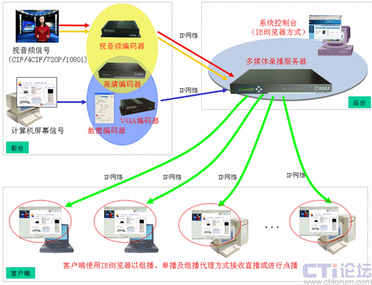 可通過單播或組播方式將會議現(xiàn)場的視頻、音頻、計(jì)算機(jī)動(dòng)態(tài)屏幕在網(wǎng)絡(luò)上進(jìn)行實(shí)時(shí)直播,用戶可通過IE瀏覽器登錄服務(wù)器實(shí)時(shí)接收直播的視頻、音頻和計(jì)算機(jī)動(dòng)態(tài)屏幕內(nèi)容。系統(tǒng)獨(dú)家支持組播代理功能,無須更改網(wǎng)絡(luò)設(shè)備的設(shè)置即可實(shí)現(xiàn)跨網(wǎng)段的組播。系統(tǒng)獨(dú)家支持文件組播功能,可將錄制好的文件在網(wǎng)絡(luò)上再次進(jìn)行組播。