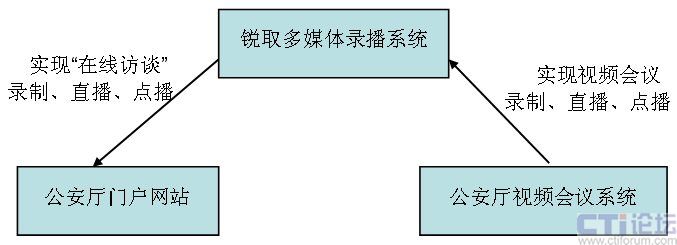 銳取多媒體錄播系統(tǒng)采用了分布式的架構(gòu),前端的視音頻編碼器負(fù)責(zé)視音頻信號的采集,后臺的多媒體錄播服務(wù)器負(fù)責(zé)信號的錄制、直播和點(diǎn)播。前端的視音頻編碼器可從視頻會議系統(tǒng)中獲取信號,這樣“在線訪談”的公安機(jī)關(guān)領(lǐng)導(dǎo)或?qū)<铱梢栽谝曨l會議中的任何一個(gè)會場與廣大網(wǎng)民在線交流。