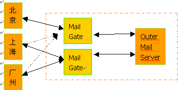1. 正常工作時(shí)北京的內(nèi)部郵件服務(wù)器通過(guò)Mail Gate 1與外部郵件服務(wù)器通訊,上海、廣州通過(guò) Mail Gate 2與外部郵件服務(wù)器通訊;