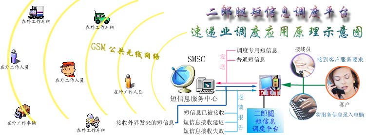 二郎腿短信息調(diào)度平臺是利用目前社會上大眾普遍擁有手機(jī)的現(xiàn)成資源,通過移動通訊公司提供的短信息服務(wù)功能作為通信信道,直接對手機(jī)進(jìn)行低層操作控制,以“收發(fā)短信息”的方式來實現(xiàn)信息的傳遞(通信資費(fèi)標(biāo)準(zhǔn)與在手機(jī)上收發(fā)短信相同)。調(diào)度平臺還對每條發(fā)出的信息的接收狀態(tài)進(jìn)行跟蹤,確保信息能被安全