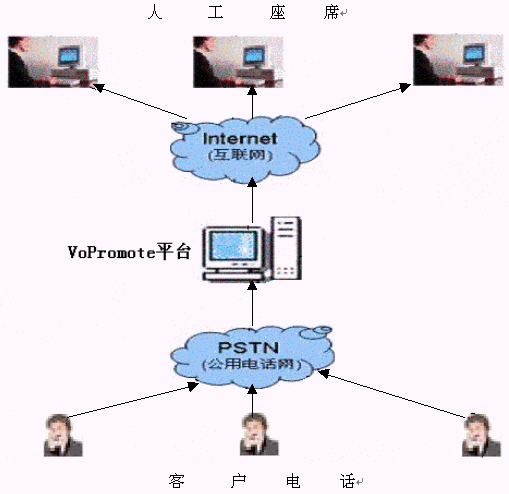 傳統(tǒng)方式為呼叫方撥通電話后直接進(jìn)入電信網(wǎng)絡(luò)以模擬信號的傳播與被叫方通話。VoPromote語音平臺的VOIP解決方案為:外呼電話接入VoPromote語音平臺,通過VoPromote語音平臺的解析后模擬信號轉(zhuǎn)換為數(shù)字信號以Internet網(wǎng)為媒介進(jìn)行語音數(shù)據(jù)的傳輸。接收方只需在接入Internet網(wǎng)的計(jì)算機(jī)上安裝聲卡即可通過主機(jī)的聲音輸入/出接口來實(shí)現(xiàn)與對方的通話。從而利用網(wǎng)互聯(lián)網(wǎng)打一通"免費(fèi)電話"。