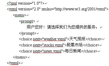 目前人們對HTML已經(jīng)很熟悉,類似于用于Web網(wǎng)頁標記的HTML,VoiceXML是為語音應(yīng)用制訂的語音可擴展標記語言。VoiceXML使公用電話網(wǎng)與互聯(lián)網(wǎng)的結(jié)合體現(xiàn)在三個方面:語音瀏覽器的使用,互聯(lián)網(wǎng)和公用電話網(wǎng)的信息共享,以及類似于Web網(wǎng)頁開發(fā)過程的語音應(yīng)用系統(tǒng)的開發(fā)。
