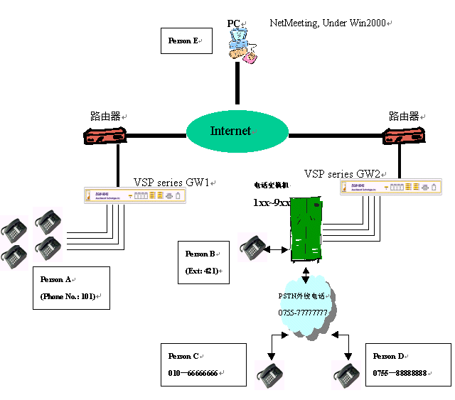1、 兩臺(tái)語音網(wǎng)關(guān),分別為 GW1 和GW2,與另外一臺(tái)電腦同時(shí)連接在internet上。