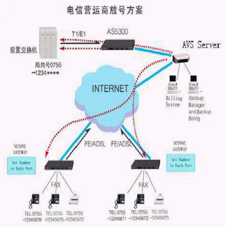 電信運(yùn)營(yíng)商放號(hào)方案采用寬帶數(shù)據(jù)網(wǎng)絡(luò)接入到運(yùn)營(yíng)商,IP電話數(shù)據(jù)流通過寬帶數(shù)據(jù)網(wǎng)絡(luò)接入運(yùn)營(yíng)商的局端網(wǎng)關(guān)設(shè)備,或者直接進(jìn)入IP電話網(wǎng)絡(luò)。與傳統(tǒng)的電話相比,電信運(yùn)營(yíng)商放號(hào)方案不需要太多的額外投資購(gòu)買硬件設(shè)備;只需在用戶端安裝NETONE語(yǔ)音網(wǎng)關(guān)或IP電話機(jī),話吧、網(wǎng)吧、企業(yè)網(wǎng)用戶、校園網(wǎng)用戶及個(gè)人用戶就可以在現(xiàn)有的網(wǎng)絡(luò)基礎(chǔ)上實(shí)現(xiàn)IP電話放號(hào)服務(wù)。