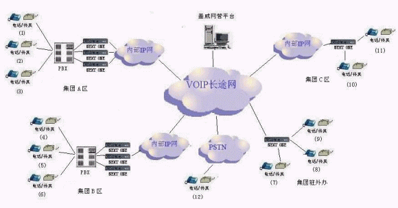 深圳市蓋威科技有限公司完整的語音解決方案如下,用一個網(wǎng)管平臺(AVS SERVER)來管理眾多企業(yè),各企業(yè)分支機(jī)構(gòu)間可以實現(xiàn)相互通話免話費,另外將企業(yè)內(nèi)部通話之外的電話通過網(wǎng)管平臺接入到電信營運商的VoIP