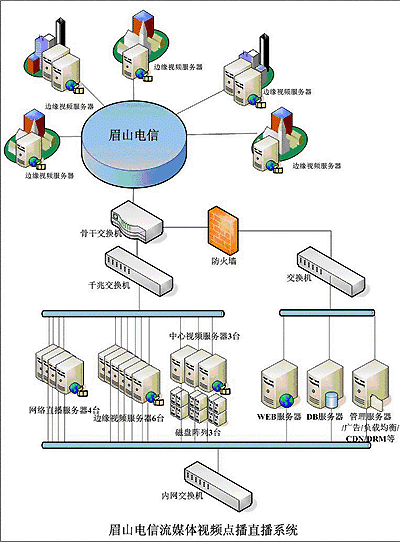 2004年10月隨著四川眉山電信公司寬帶網(wǎng)建設(shè)的日益完善和寬帶接入業(yè)務(wù)的迅速發(fā)展,公司原先擁有一套簡單的流媒體服務(wù)系統(tǒng),從功能和性能上都不能滿足業(yè)務(wù)的需要,公司決定建設(shè)一套運(yùn)營級(jí)的流媒體視頻服務(wù)系統(tǒng),提供3000個(gè)并發(fā)的視頻點(diǎn)播服務(wù)和8路的網(wǎng)絡(luò)電視直播、并提供DRM文件的加密下載。