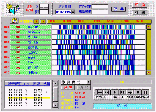 以時間為水平軸、分機號碼為垂直軸機制,錄音分布狀況一目了然。該窗口下,可經(jīng)由日期、分機之選擇、或客戶代號之輸入,輕松找到您要聽取錄音檔。您只要點取錄音棒的定點,即得知錄音記錄清單,播放操作:
