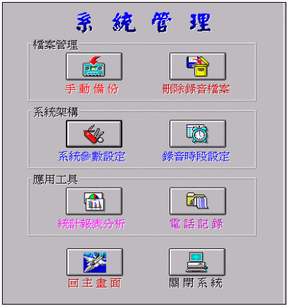 三個方塊區(qū):檔案管理區(qū)、系統(tǒng)架構區(qū)和應用工具區(qū)。各方塊區(qū)內有其包含之功能指令。此外,"回主畫面"的功能鍵提供您可回到主窗口畫面的功能;"關閉系統(tǒng)"功能鍵則提供您正常操作關掉此錄音系統(tǒng)的功能。您不須依賴操作手冊,也不需要別人指導,您就可以執(zhí)行一些系統(tǒng)維護設定功能。