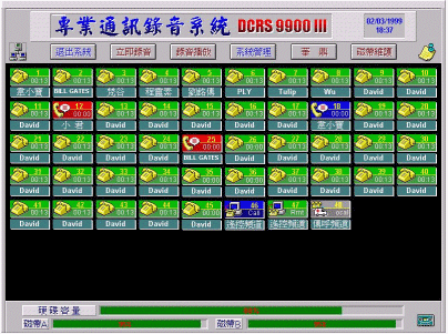 DCRS與BRS系列之全數(shù)字專業(yè)通訊簿音系統(tǒng),彩色動畫窗口,配合鼠標操作,使您一目了然,操作容易。您可由主窗口圖標中,清楚知道每一回路目前錄音狀態(tài),例如呈綠色的圖標是顯示回路是閑置狀態(tài)(沒有通話狀態(tài)),用不同顏色加上不同圖案,是最易懂、最一目了然表現(xiàn)方式。各種操作按鍵與儲存裝置(Storage Media)狀態(tài)也出現(xiàn)在很醒目位置上也是另一系統(tǒng)特色。下面文章對回路各種常見圖標有進一步說明。