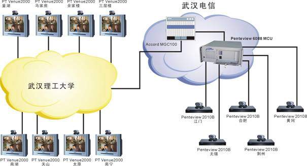 武漢理工大學(xué)的遠(yuǎn)程教學(xué)系統(tǒng)由于分3期建設(shè),網(wǎng)絡(luò)條件較為復(fù)雜。一期主要以PT的Venue2000終端+Accord MGC100 MCU為主,是一個H323系統(tǒng);二、三期采用中太多媒體的Penteview2010終端+Penteview6088MCU,是一個H320系統(tǒng),兩套系統(tǒng)通過網(wǎng)關(guān)無縫結(jié)合到一起工作,用戶根本感覺不到不同。各教室均同時采用了中太多媒體的遠(yuǎn)程教學(xué)支撐系統(tǒng),通過對Penteview會議電視系統(tǒng)的擴(kuò)充,實現(xiàn)了以下功能,使教學(xué)應(yīng)用更加方便: