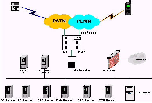 整個(gè)系統(tǒng)平臺(tái)前端接入可直接從電信或移動(dòng)交換機(jī)提供的信號(hào)接入,如中國(guó)一號(hào)、SS7以及ISDN等,通過PBX連入平臺(tái)核心VoiceMe服務(wù)器,系統(tǒng)接入容量可擴(kuò)至幾十個(gè)乃至上百個(gè)E1接入。系統(tǒng)主要包括語音控制、多媒體應(yīng)用和內(nèi)容管理等部分,其中主要包括: