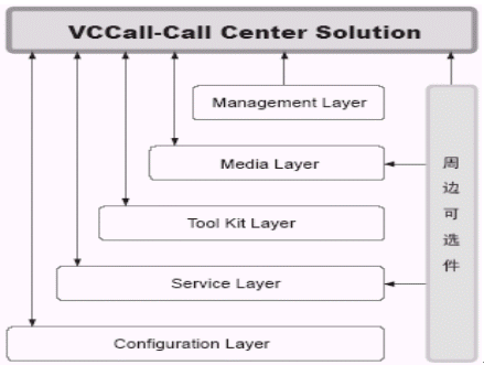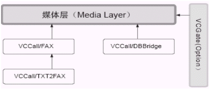 Media Layer由VCCall/DBBridge、VCGate(Option)、VCCall/FAX、VCCall/TXT2FAX、VCCall/FAX、VCCall/TXT2FAX組成VCCall媒體層提供了除電話之外進(jìn)行交互的其他媒體組件,包括:傳真VCCall/FAX、數(shù)據(jù)庫訪問媒體VCCall/DBBridge。