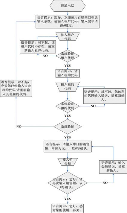 4) 不允許租戶將各個(gè)租約每天的銷(xiāo)售數(shù)據(jù)重復(fù)輸入;租戶輸入的銷(xiāo)售金額單位為元;租戶通過(guò)電話輸入的數(shù)據(jù)為"租戶代碼、租約代碼、銷(xiāo)售數(shù)據(jù)"。
