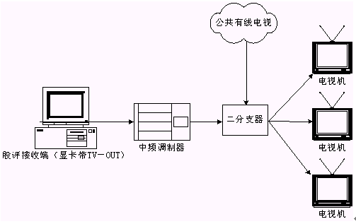 本系統(tǒng)接收端接收實(shí)時(shí)廣播時(shí),除了用普通PC機(jī)收看,或把PC機(jī)接收到的信號(hào)輸?shù)诫娨暎ù笃粒┥鲜湛矗踔吝可以接入有線(xiàn)電視網(wǎng)進(jìn)行播放。具體方法是通過(guò)一個(gè)接收端接收股評(píng)節(jié)目,通過(guò)帶TV-OUT的顯卡把TV信號(hào)輸出到中頻調(diào)制設(shè)備,中頻調(diào)制設(shè)備可以把基帶模擬信號(hào)轉(zhuǎn)換成一個(gè)有線(xiàn)電視信號(hào),且傳輸距離遠(yuǎn),損失小,再把這個(gè)信號(hào)與有線(xiàn)電視信號(hào)一起接入一個(gè)二分支器(2進(jìn)1出),這就可以和公共有線(xiàn)電視共存,形成自己的頻道,供電視接收。