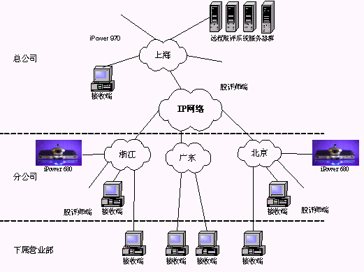 某證券公司有三級(jí)網(wǎng)絡(luò),總公司、分公司和下屬營(yíng)業(yè)部?偣镜椒止編捠2M,在總公司配置一套會(huì)議室型電視會(huì)議終端POLYCOM 970和一套多點(diǎn)會(huì)議服務(wù)器Radvision ViaIP400。在分公司配置了38套會(huì)議室型電視會(huì)議終端POLYCOM 680,用于與總公司進(jìn)行雙向視頻會(huì)議。分公司到營(yíng)業(yè)部帶寬是512K,各營(yíng)業(yè)部安裝遠(yuǎn)程股評(píng)系統(tǒng)接收端程序,遠(yuǎn)程股評(píng)系統(tǒng)服務(wù)器都放置在海通總公司。當(dāng)在總公司進(jìn)行股評(píng)時(shí),總公司本地?cái)z像頭拍攝教師畫(huà)面,MIC采集教師聲音,傳給服務(wù)器編碼,再通過(guò)網(wǎng)絡(luò)供各個(gè)接收端接收;當(dāng)在分公司進(jìn)行股評(píng)時(shí),首先分公司的電視會(huì)議設(shè)備采集教師畫(huà)面及聲音傳回總公司的電視會(huì)議設(shè)備,再傳給遠(yuǎn)程股評(píng)系統(tǒng)的服務(wù)器進(jìn)行編碼,然后通過(guò)網(wǎng)絡(luò)發(fā)布,供接收端接收。(結(jié)構(gòu)如下圖)