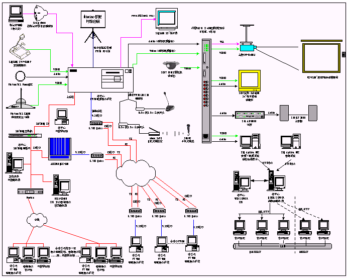 1、 電視會(huì)議系統(tǒng)包括一臺(tái)MCU和13臺(tái)iPower900,通過IP網(wǎng)絡(luò)和E1專線兩種線路連接。為了將視頻會(huì)議的功能進(jìn)行擴(kuò)展,我們增加了多種外圍設(shè)備,包括:實(shí)物投影儀、白板掃描儀、無線話筒、DV31攝像機(jī)等輸入設(shè)備,彩色電視機(jī)、三菱投影機(jī)和功放、音箱等輸出設(shè)備以及8×4視頻切換矩陣。