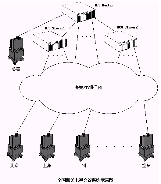 與海關(guān)ATM網(wǎng)一樣,海關(guān)電視會(huì)議系統(tǒng)也是以總署為中心的星形結(jié)構(gòu)?偸鹋渲糜腥齻(gè)相互級(jí)連的MCU,其中一個(gè)為Master,另外兩個(gè)為Slaver,分署和各海關(guān)的會(huì)議終端設(shè)備通過ATM網(wǎng)的PVC信道分別連接到Master或Slaver