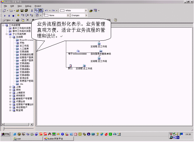 該產(chǎn)品通過(guò)將所有業(yè)務(wù)分別處于樹形化的節(jié)點(diǎn)上,可以直觀的對(duì)業(yè)務(wù)進(jìn)行增加、刪除、修改的管理。增加子業(yè)務(wù)的時(shí)候,必須帶有業(yè)務(wù)類別,實(shí)現(xiàn)業(yè)務(wù)管理歸類化,避免業(yè)務(wù)管理的混亂。該產(chǎn)品還支持業(yè)務(wù)流程的樹形化表示,使業(yè)務(wù)流程開(kāi)發(fā)者可以方便地了解業(yè)務(wù)流程的全局框架。