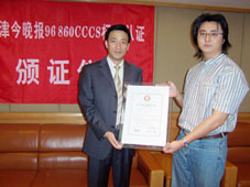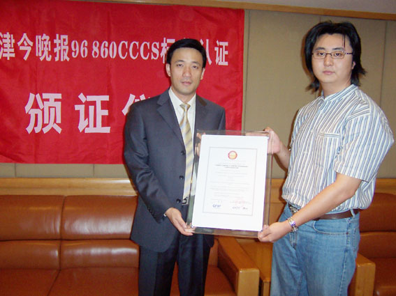 2004年9月9日,天津今晚報(bào)公眾服務(wù)中心通過了《全國呼叫中心運(yùn)營績效標(biāo)準(zhǔn)》(CCCS-OP-2003)認(rèn)證,并獲得由中國信息化推進(jìn)聯(lián)盟客戶關(guān)系管理專業(yè)委員會(huì)頒發(fā)的認(rèn)證證書(四星級(jí)客戶服務(wù)中心),成為國內(nèi)傳媒業(yè)首家通過此認(rèn)證的呼叫中心。