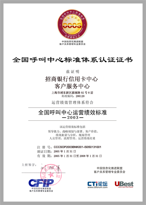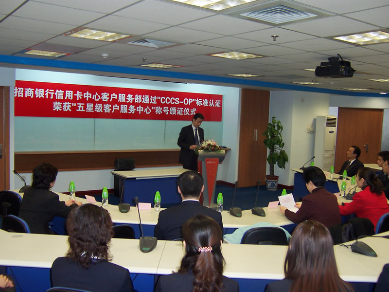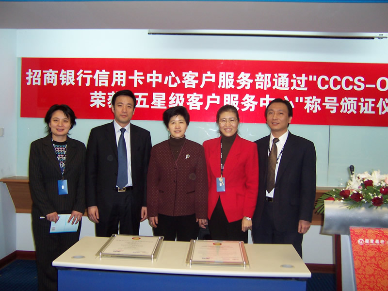 經(jīng)過長達(dá)8個月時間的準(zhǔn)備和嚴(yán)格的認(rèn)證審核,由中國信息化推進(jìn)聯(lián)盟客戶關(guān)系管理專業(yè)委員會常務(wù)副主任郭晨東先生親自掛帥組成的項目評審專家小組從領(lǐng)導(dǎo)能力、戰(zhàn)略規(guī)劃與部署、客戶價值、績效衡量與分析、現(xiàn)場管理、人員管理、流程管理、運(yùn)營績效結(jié)果等八個范疇對招商銀行信用卡中心客戶服務(wù)部進(jìn)行了全面而嚴(yán)格的審核,涉及五大類上百項詳細(xì)的運(yùn)營績效指標(biāo),歷經(jīng)初審評估、現(xiàn)場初審、初審評估報告提交與確認(rèn)、標(biāo)準(zhǔn)試運(yùn)行、績效全面提升、最終評審等階段,最終審核確認(rèn)招商銀行信用卡中心客戶服務(wù)完全符合并部分超越《全國呼叫中心運(yùn)營績效標(biāo)準(zhǔn)》(CCCS-OP-2003)的各項標(biāo)準(zhǔn)指標(biāo)和要求,于2005年1月31日正式批準(zhǔn)招商銀行信用卡中心通過該標(biāo)準(zhǔn)的五星級認(rèn)證,授予“五星級客戶服務(wù)中心”稱號。