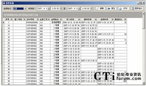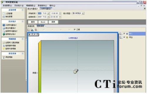系統(tǒng)提供統(tǒng)計(jì)報(bào)表生成工具,實(shí)現(xiàn)對(duì)系統(tǒng)訪問(wèn)次數(shù)的統(tǒng)計(jì)與分析,并以圖示直觀地反映出用戶關(guān)注的熱點(diǎn)?砂粗鹘刑(hào)碼、局向統(tǒng)計(jì)時(shí)長(zhǎng),并自動(dòng)生成效果圖,直觀表現(xiàn)業(yè)務(wù)發(fā)展。還可根據(jù)主叫統(tǒng)計(jì)時(shí)長(zhǎng),當(dāng)天分析,本周分析,本月分析,提供時(shí)長(zhǎng)走勢(shì)圖(可以以小時(shí)為單位分析時(shí)長(zhǎng)的走勢(shì),也可以以天為單位分析時(shí)長(zhǎng)的走勢(shì))