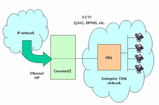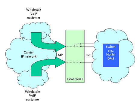 圖1中的GroomerII支持PRI協(xié)議,如:NI-2、ETS300和INS1500等,可以實(shí)現(xiàn)網(wǎng)關(guān)的功能把運(yùn)營商自己的電路交換網(wǎng)和IP網(wǎng)絡(luò)相互連接在一起。這種設(shè)置允許網(wǎng)絡(luò)運(yùn)營商向其他業(yè)務(wù)供應(yīng)商提供批量VoIP業(yè)務(wù)。這類業(yè)務(wù)運(yùn)營商據(jù)此可以向他們的客戶提供具有區(qū)分性的業(yè)務(wù),如:利用SIP電話呼叫等。
