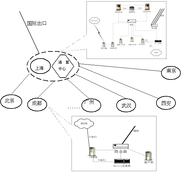 數(shù)據(jù)網(wǎng)絡(luò)為DDN專線構(gòu)成的Intranet,該Intranet在國內(nèi)可以有一個(gè)以上的國際出口。并通過防火墻同Internet連接。語音/數(shù)據(jù)的傳輸采用網(wǎng)絡(luò)交換設(shè)備。