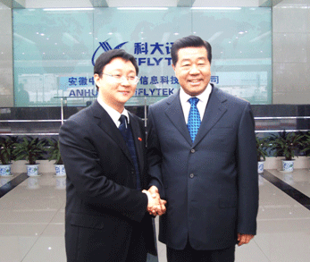 12月19日上午,中共中央政治局常委、全國政協主席賈慶林一行在安徽省委書記郭金龍、省長王金山等省市領導陪同下來到國家863計劃成果產業(yè)化基地——科大訊飛公司視察,賈慶林主席對科大訊飛在中文語音技術和產業(yè)化方面的成績給予充分肯定。上午8時30分,賈主席一行抵達訊飛語音產業(yè)大樓。中國科技大學黨委書記郭傳杰、科大訊飛總裁劉慶峰博士、基地總工陳濤及基地工作人員熱烈歡迎賈主席的到來。