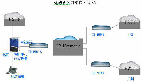 遠端接入:根據(jù)實際遠端中繼數(shù)量,選擇IP MUX4/8/16網(wǎng)關(guān),通過環(huán)路中繼接口連接本地的電信網(wǎng);